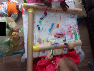 Souffler des bulles et les observer. Quand elles éclatent, aider les enfants à remarquer qu'elles sont disparues (permanence de l'objet). Vous amuser à faire éclater les bulles en les attrapant avec les enfants pour explorer la cause à effet.